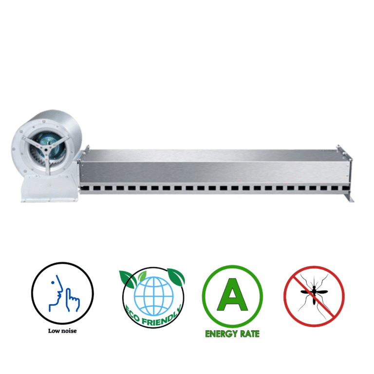 הדגם מצויד במאוורר צנטריפוגלי מתקדם המייצר זרימת אוויר חזקה ואחידה, תוך שמירה על רמת רעש נמוכה יחסית. תכנון זה מאפשר יצירת מחסום אוויר יעיל במיוחד בכניסות לחדרים מקוררים, גם כאשר יש תנועה תכופה של אנשים או ציוד.