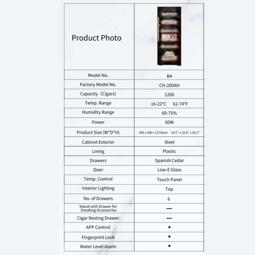 במקביל, ניתן לשלוט על מכשירי הלחות לסיגרים של Ania על ידי האפליקציה שלנו (אופציה). המכשיר מצויד גם במנעול טביעת אצבע להגנה על הסיגרים (אופציה) .